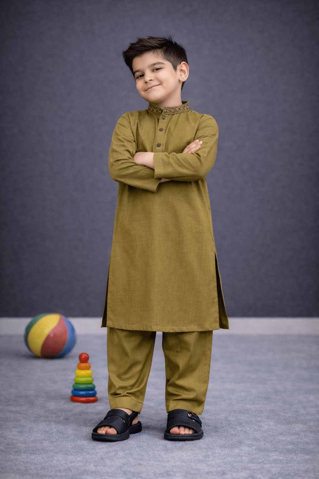 Stylish boys olive green kurta shalwar from our Winter Collection, featuring embroidered neckline and a comfortable winter fabric. Designed for kids aged 5–7 years, perfect for Eid, weddings, and festive occasions.