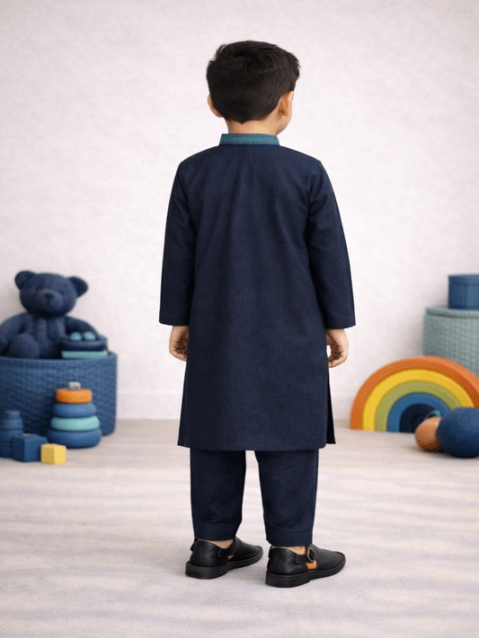 Premium boys navy blue kurta shalwar from our Winter Collection, crafted in warm and comfortable fabric. Featuring contrast embroidered neckline and matching navy blue shalwar. Ideal for winter Eid, weddings, and festive wear for kids aged 5–7 years.